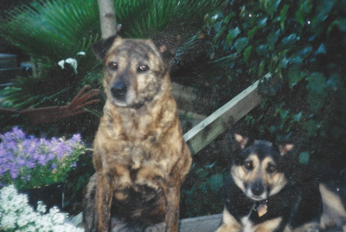 Gamba, at this time 14, had heavy losses in sight and hearing. On our daily AM walks both Mike and I noticed that she followed Daisy, her black & white signpost. In the park Daisy once caught a gopher but didn’t have the strength to kill it. Gamba (combo Pit-bull, Chow and German Shepherd) took it from her, bit it in half and presented it to Mike and me.