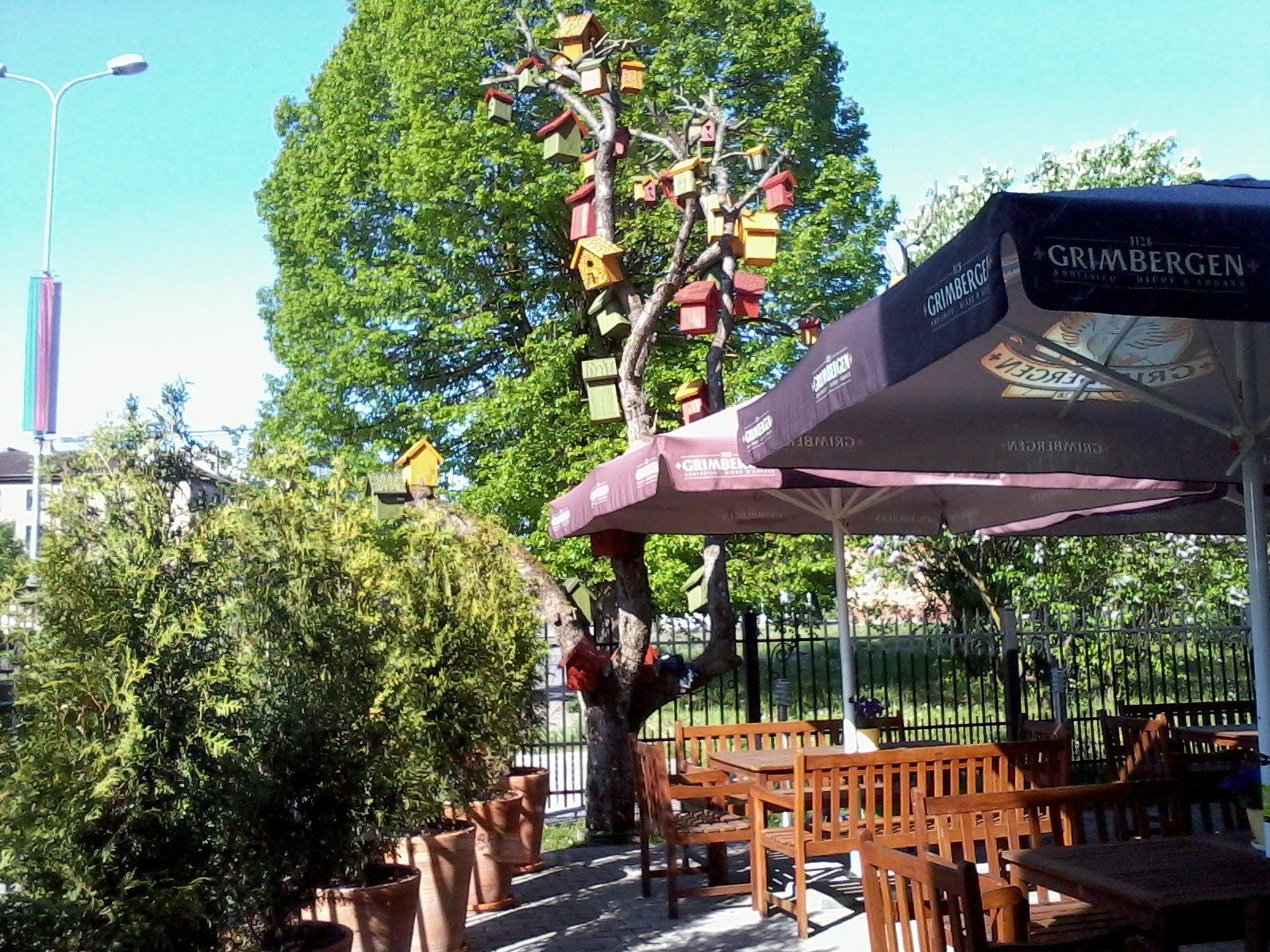 And of course the bar is more comfortable than the dining room when you are sliding off your seat or nodding off! (It’s acceptable.) The door to the outside patio opened to a tree loaded with multi colored birdhouses and many small “cheeps”.