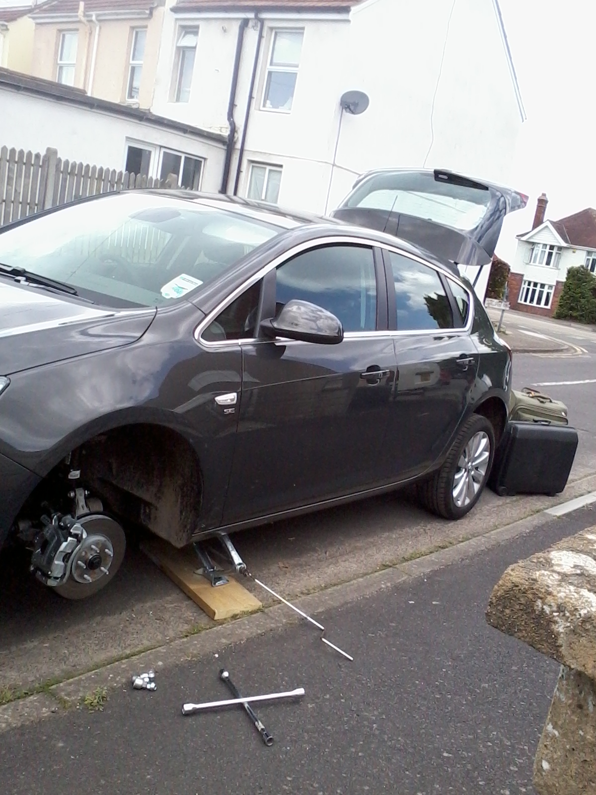 Photo064The catastrophe reversed when Isabella, an elderly woman  from the house overlooking our car, came  out offering coffee, tea and a bathroom.  Then Jamie, 40 and recovering from a job injury, came from across the street  carrying a jack.  Nothing in the rental trunk but a can of spray to inflate the tire!??!