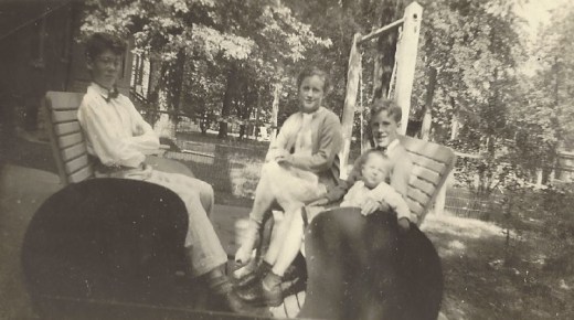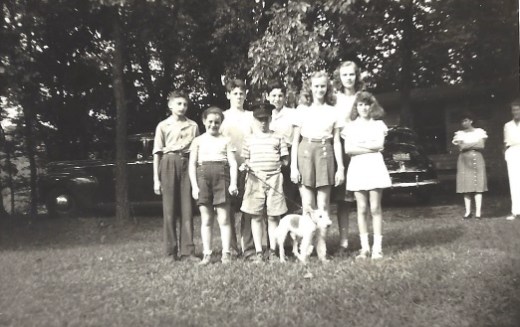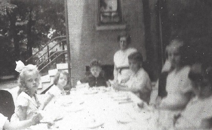 The Feuerbachers had a “river house” and in this first picture you can even see a little bit of the river on the left. Immediately after the photograph both my brothers and I ran into the house to get our swim suits. And we went screaming down for the rope that out dad had helped us tie on a tree above the water. And one at a time leaped onto the rope and off into the river! All the other kids were forbidden- except Georgie (on my right side) he came running after- in his underwear!