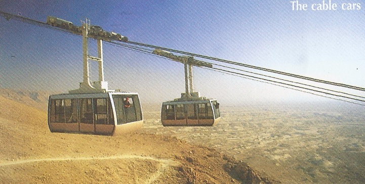 There are two ways to travel to the top: walking the Snake path (curvy, stony, and hot), or taking the Cable Car. Easy decision! You can see the top of the Snake beneath the cars. Obviously the structures were build around the mountain rim for protection. The center plateau was used for farming and cattle/sheep raising. For this water was essential but scarce.