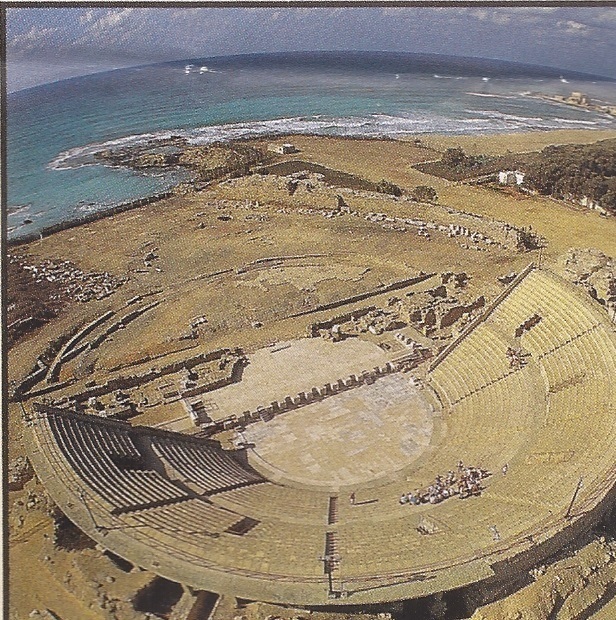 Looking more closely at this second picture, you get a good overview of the excavated sites. The original port is submerged. If you look to the right, you can see the long, curving arm that protects the sunken port. There are choices to view this: swimming/scuba diving or seeing the films. We chose the movie which included the port foundations and parts of sunken ships. Excellent! Finally, looking straight ahead at the same picture, the Roman Amphitheater looks like a brown donut.