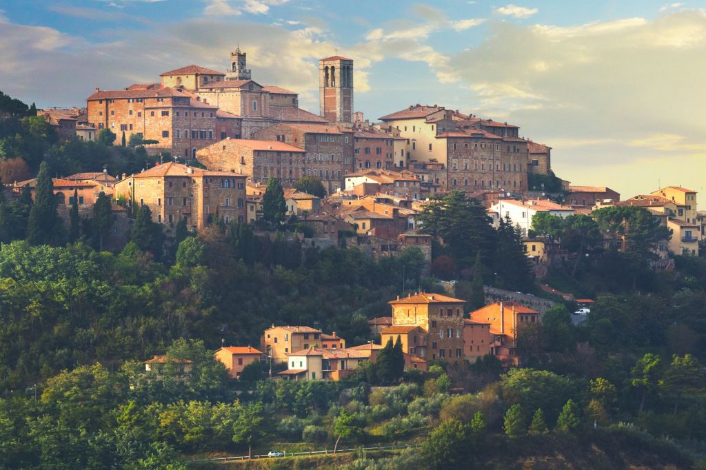 Off to Chianciana Terme to see Nervi’s ’40 pavilon. Lovely– then to hill town/winetown of Montepuliciano—beautiful–”boxy” shaped town, both buildings and layout- lots of stone squares, kind of barren of flowers and plants inside but surrounded by nature outside. Ate lunch in large plaza, saw 2 kids helping big old dog- fun! Then to tasting for Mike at Contucci Winery-oak barrels–back at 4:45 p.m. Dining again at “Albergaccia”. Same excellent meal (lamb morsels)–began to rain, but coffee/wine anyways again at bar across from hotel. Late– Mike sharing wine with hotel people in lounge. (Albergaccia was a lot of fun!)