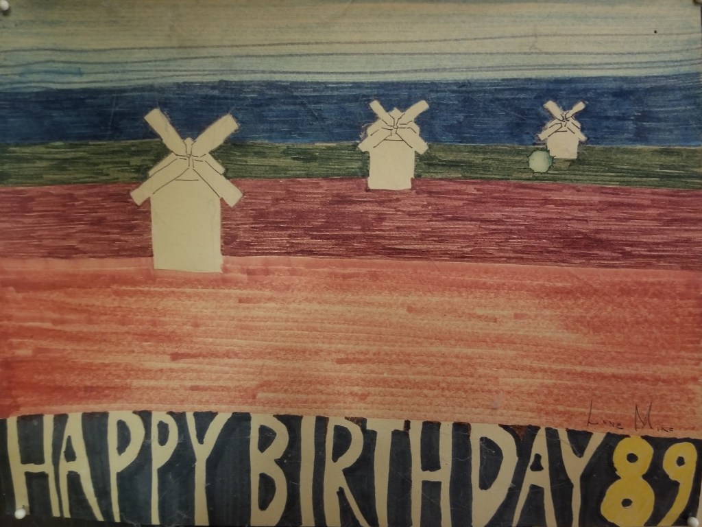 Now the birthday cards. The ’89 card represents the famous windmills of the area of La Mancha –a stop on our very first trip out of Madrid in our leased car. On this week long trip we covered major parts of Andalusia and southern Portugal. As an aside: in Madrid we housed in a bare-bones pensione with a great location near the historic center of the city within easy walking distance of the Prado Museum to our east and the Plaza Major to our west. When we traveled our landlady, Angela, would have our room (a large bedroom with 2 lounge chairs, and an en suite bathroom with a shower) ready for us on return and didn’t charge us for the lapsed time. She also kept our excess luggage.