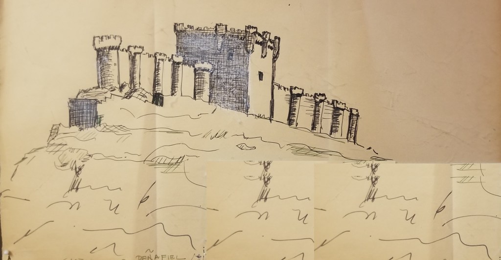 The ’91 drawing is of the Castle of Penafiel, north of Madrid, in the wine area of Ribera del Duero. An actual working winery is dug into the base of the castle’s mountain. Spain has around 2000 castles that were built for village protection during the long-drawn out battle between Christians and Moors during the reconquest of Spain from the 8th century to 1492.