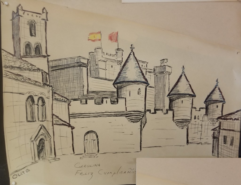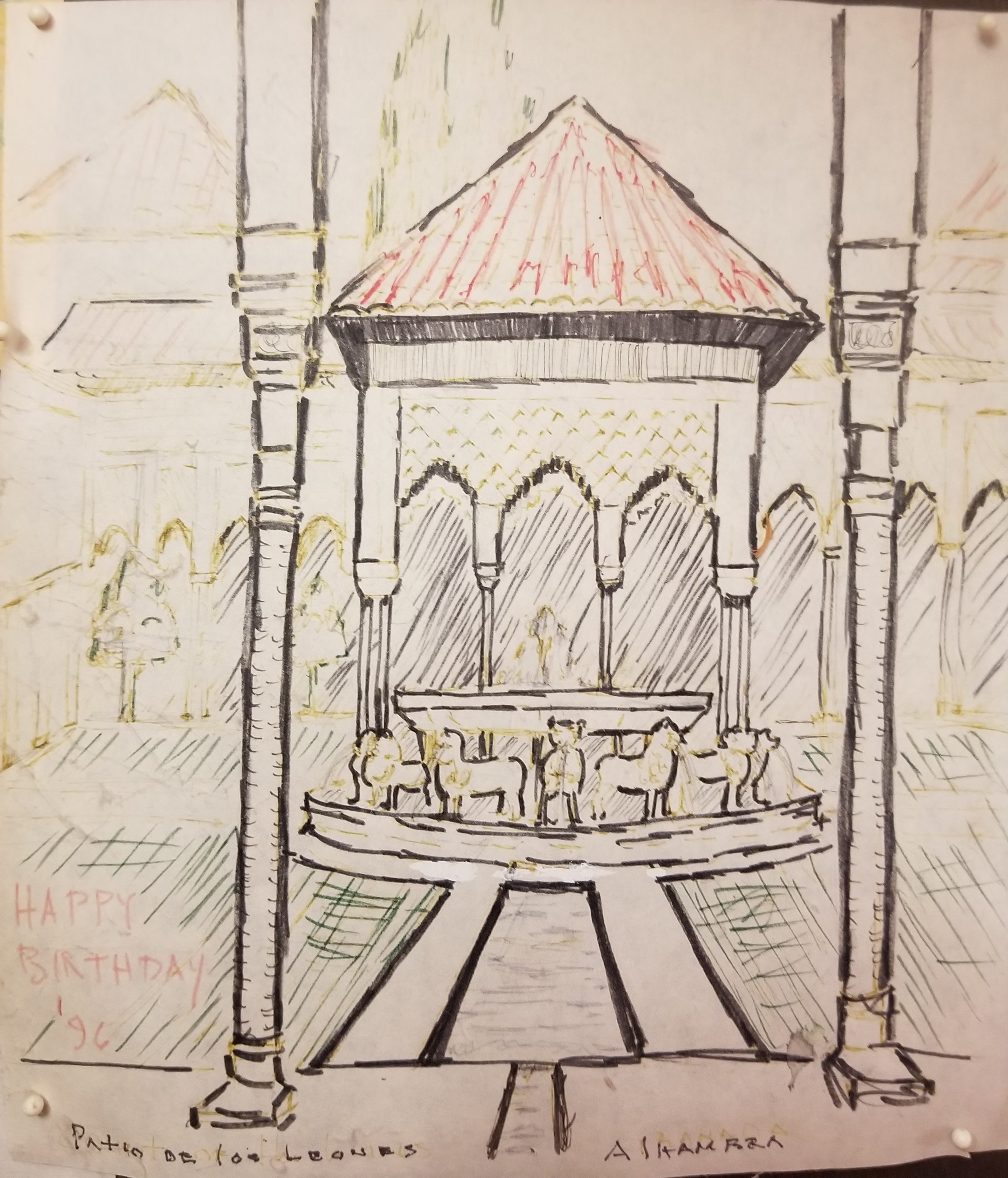 In 1989 Mike started a tradition –now in its 30th year–of drawing for me birthday cards commemorating our travels. In 1989 Mike took a sabbatical of 3+ months in Spain. While we were based in Madrid we took off on many side trips throughout Spain to reinforce his research and to delve into Spanish history and cultural—and, yes,visit vineyards and wineries.