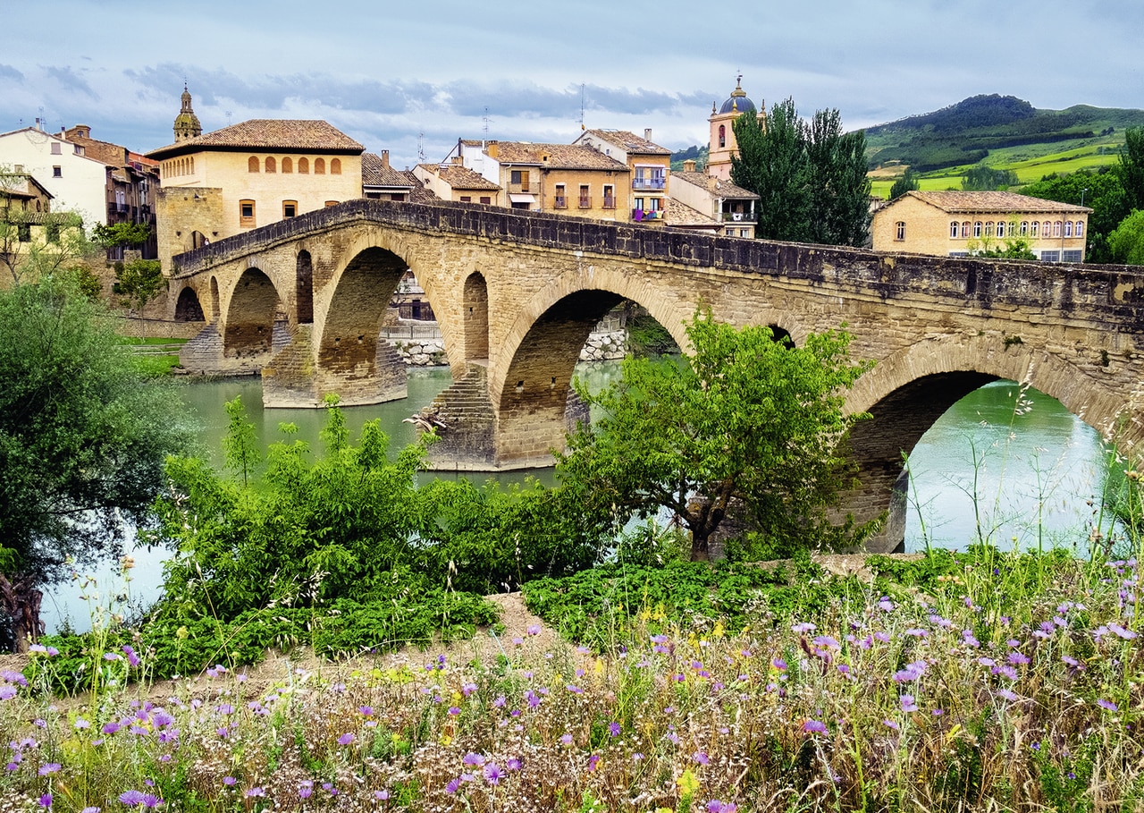 Both the ’93 and ’94 cards commemorate a 3 week summer trip we took in 1993 along the Camino de Santiago de Compostela. The Royal Palace of Olite (’93), started in the 13th century, guards the walled village of Olite which lies a short distance south of Pamplona. The Palace includes a Parador where we spent 2 nights. The humped-back Romanesque Puente of Reina (’94) was built in the 11th century for pilgrims who were traveling the Camino. The 3 arch bridge sits serenely over the placid water.