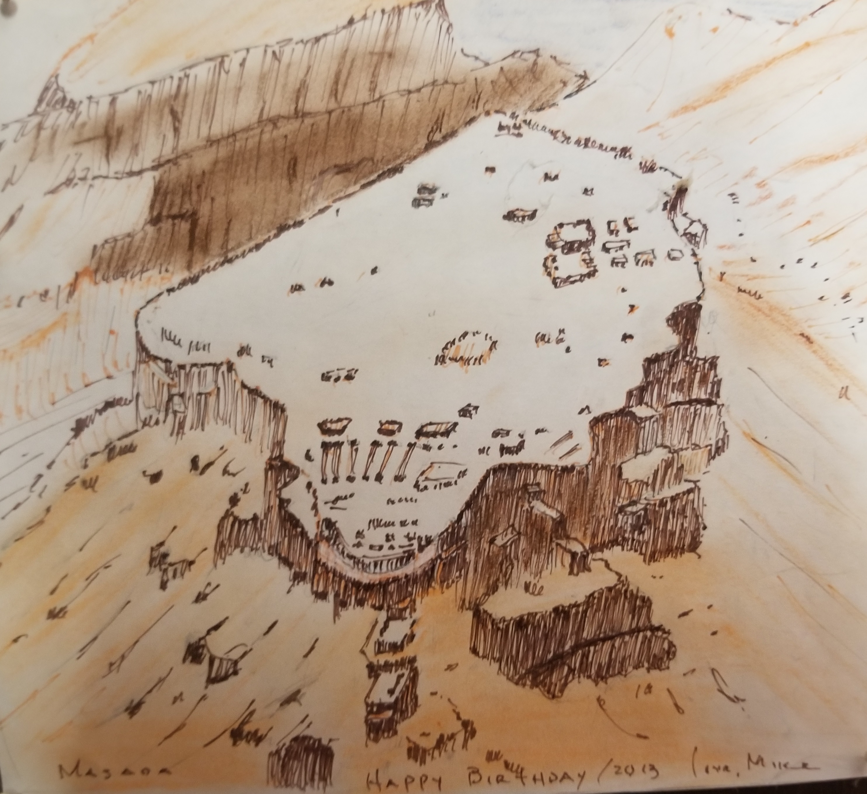 Our 2013 trip to Israel is recalled by the birthday card that portrays a bird’s-eye-view of the archeological site of Masada. Masada, which sits on a 1200′ elevation rock that overlooks the Dead Sea, was built by Herod the Great in the 1st century BCE. Two centuries later the fortress was captured by a Jewish sect, the Zealots (from which we get the English word), in a revolt against Rome–this was the Jews’ last stand. After a long siege the Romans took the fortress only to find that all 960 of the sect committed suicide rather than surrender. Masada represents Israeli patriotism as its proudest–and perhaps at its most foolish.