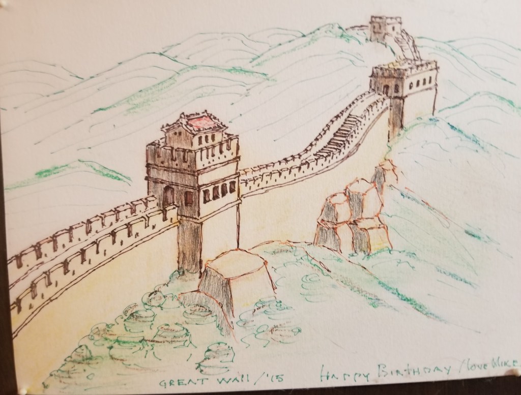Our trip to China in the Spring of ’15 (to peek into the emerging wine industry and visit cultural sites, as well) was unique for us in many ways. It was our first (and only to this date) to East Asia. It was the only trip we’ve taken in which we didn’t drive ourselves–China doesn’t allow foreign tourists to rent cars–we took flights to all four links of our trip. This was our first trip with guides throughout and valuable guides (with drivers) at that–they picked us up and returned us to airports–helping us through passport control and the other confounding issues of modern travel.–and, of course, relayed important insights to all cultural sites.We flew into Beijing and were taken to a lovely 100 year old hotel that was formerly a three generation town house. We did the usual tourist stops–including Tienanmen Square and the Forbidden City. Then a two hour drive to a section of the Great Wall which is shown on the ’15 birthday card. This portion of the several thousand mile wall was built around 1500, of stone, to keep out the Manchu invaders (and, perhaps, the Mexicans–if so, it was quite successful in this regard since we saw no Mexicans in China). We saw another section of the wall –this one earthen–near Yinchuan, a city on the edge of the Gobi Desert, 550 miles west of Beijing. We stayed here three nights in order to tour nearby wineries. Next, east to a three day stay in Xian–China’s first capital and the starting point of the Silk Road. Fascinating walled Old Town with its active Moslem Quarter. A short trip to the most- see Terra Cotta Warriors–the awesome ranks of life-sized pottery figures that were made to guard the tomb of a despotic ruler who unified China over 2,200 years ago. Amazing! A flight to Taiyuan and a stay at a nearby winery’s guest house–then on to the Ming Era walled city of Pingyao, with its more than 3,000 historic buildings. Back to Beijing and home.