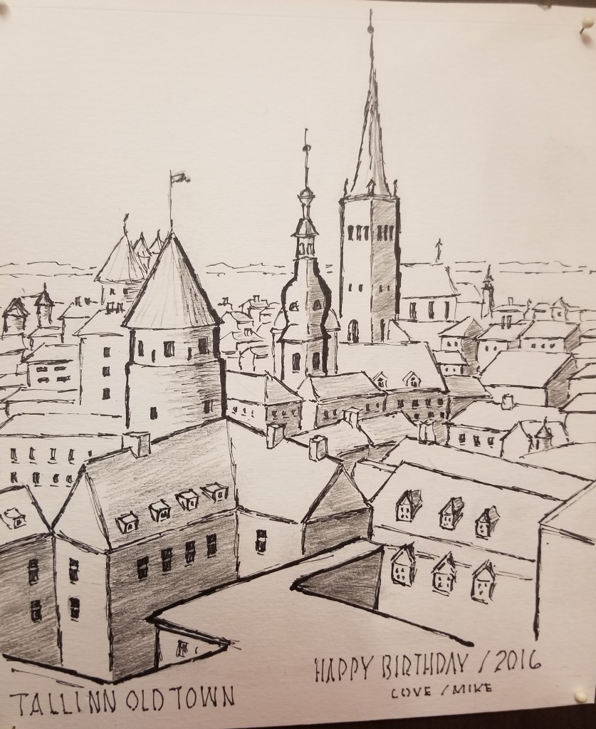 Kate and Tom flew in from Belgium to join us for a weekend in Riga. We leisurely strolled the city’s parks and took in the vast collection of turn of the 20th century Art Noveau buildings. The ’16 birthday card (one of Mike’s favorites) tries to capture the medieval lower Old Town of Tallinn from Toompea Hill–a walled-in 13th century “other old town”. In trying to drive to our hotel in the “real” Old Town Mike missed a turn and we found ourselves in a maze of one-way streets on Toompea Hill. After much frustration–and to my chagrin–Mike continued down a one way street in the wrong direction, narrowly missing a mob of cruise ship tourists who were walking up the Hill. We passed through a gate of the city wall only to encounter wrong-direction one way streets in the Old Town. We made it though to our comforting boutique hotel–whose origins date back to the 14th century. Beyond the capitals, we traversed the country side in all three countries (due to Mike’s fetish in visiting obscure wineries in regions with inhospitable climate) and found friendly towns and interesting lodging wherever we went. Two towns in particular spring to mind: Cesis, Latvia–centered around a a castle built in 1207 by the German Knights of the Sword–and the charming university town of Tartu, Estonia–which lies just a few miles west of brooding Russia and all that entails.
